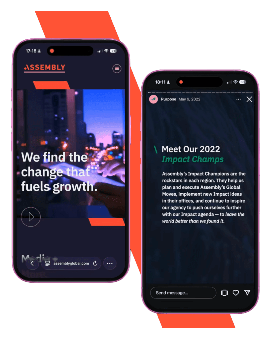 The original Assembly brand carried the spirit of its founders: fighters who wanted to reinvent media planning. The tagline was literally "not your father's Madison Ave agency." But the visual language didn't match where the company was headed post-merger. The challenge was keeping the underdog energy while opening the brand identity to something warmer and more human. We centered the strategy around Assembly's new tagline, "we find the change that fuels growth," and identified key touchpoints: the website for client credibility, LinkedIn and Instagram for talent acquisition, and internal presentation design for alignment across a newly global team. The goal was a brand that felt additive and collaborative, not just sharp and technical.